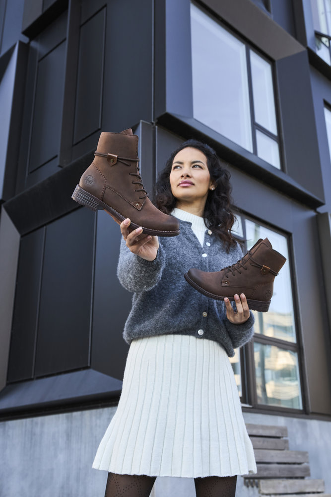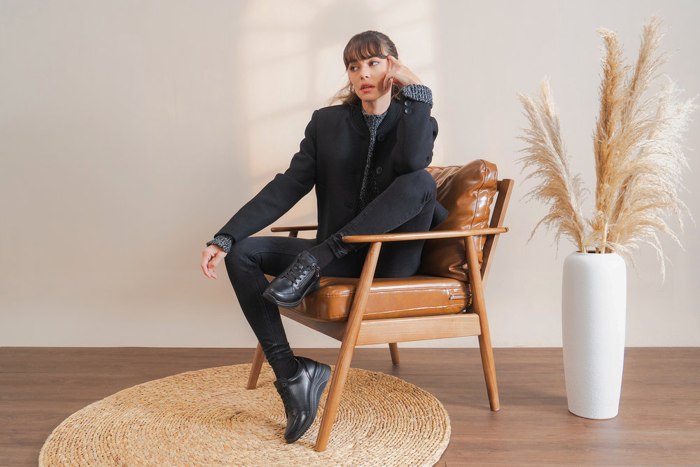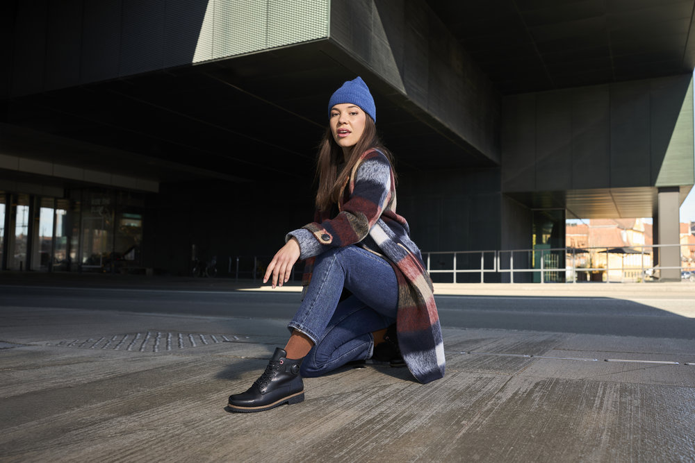 - Kožené kotníkové boty – v tmavě hnědé, bordó či černé barvě vkusně doplní outfit.