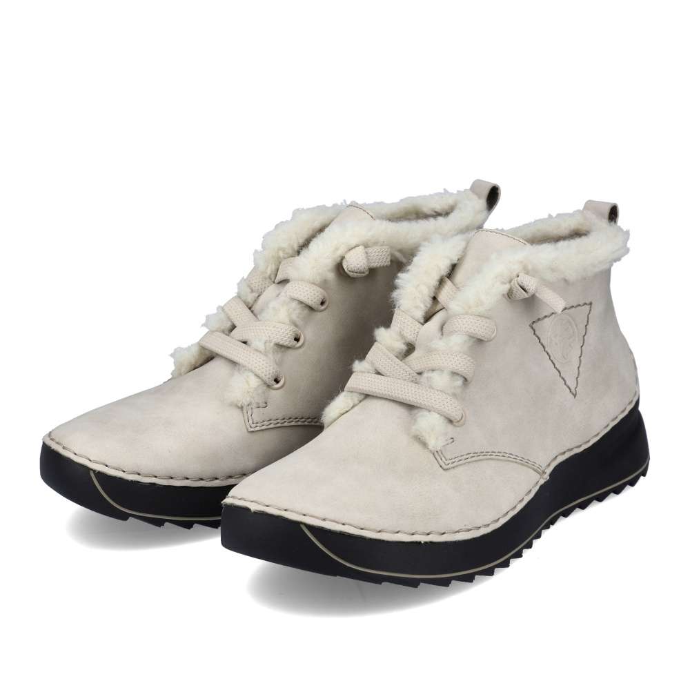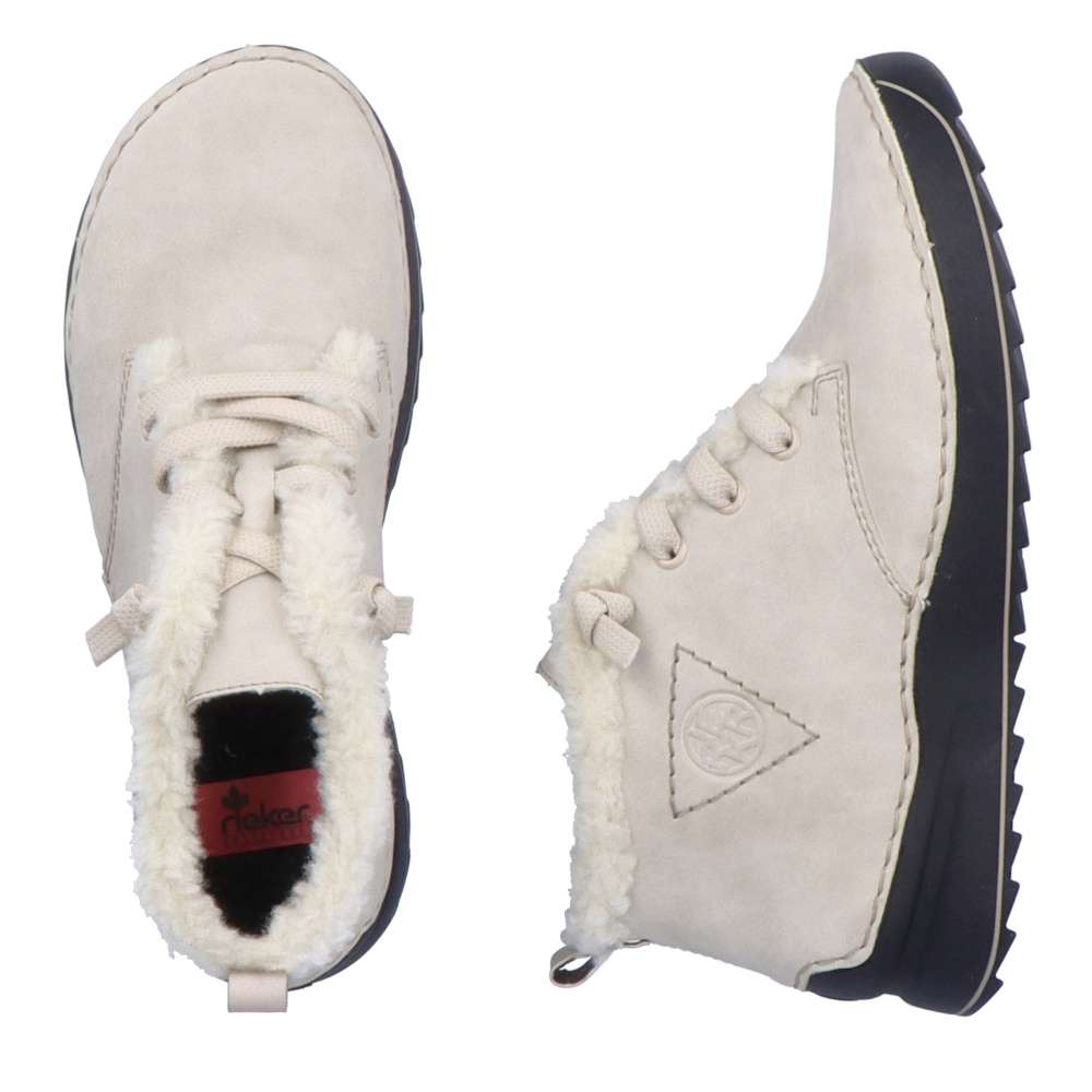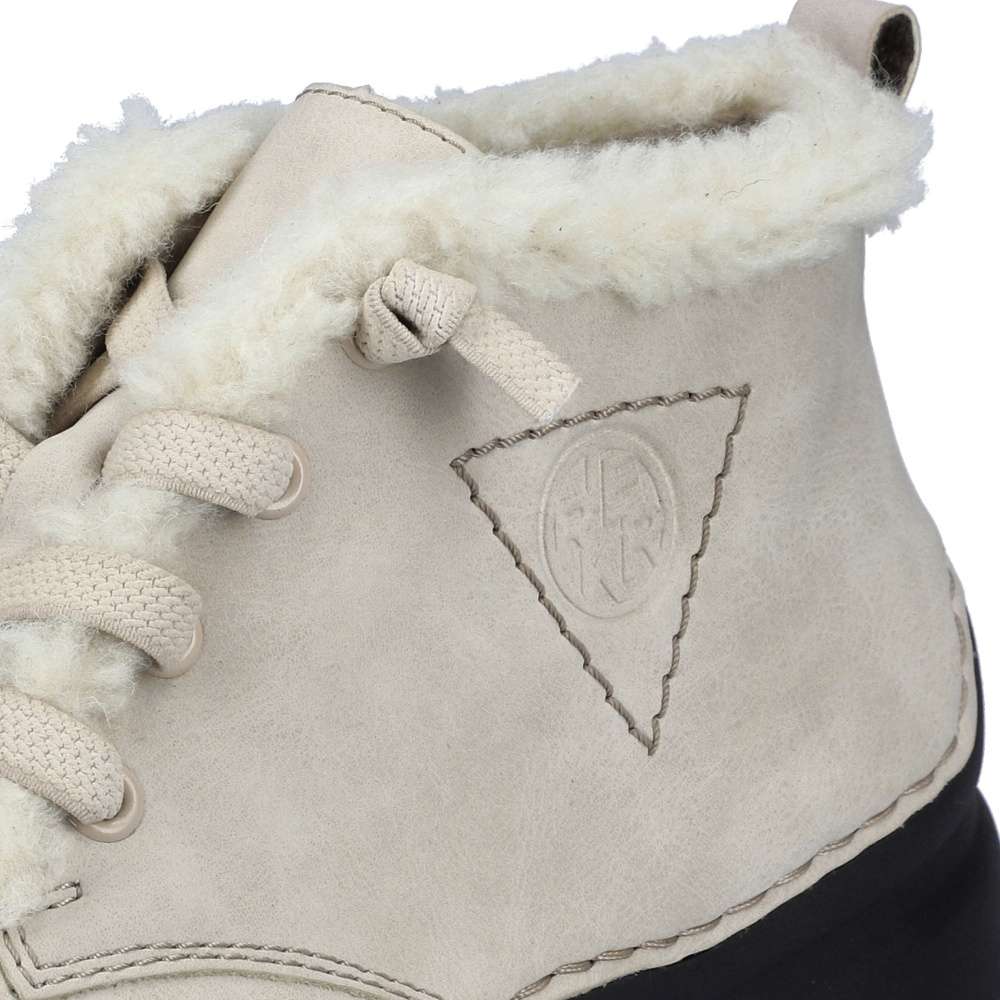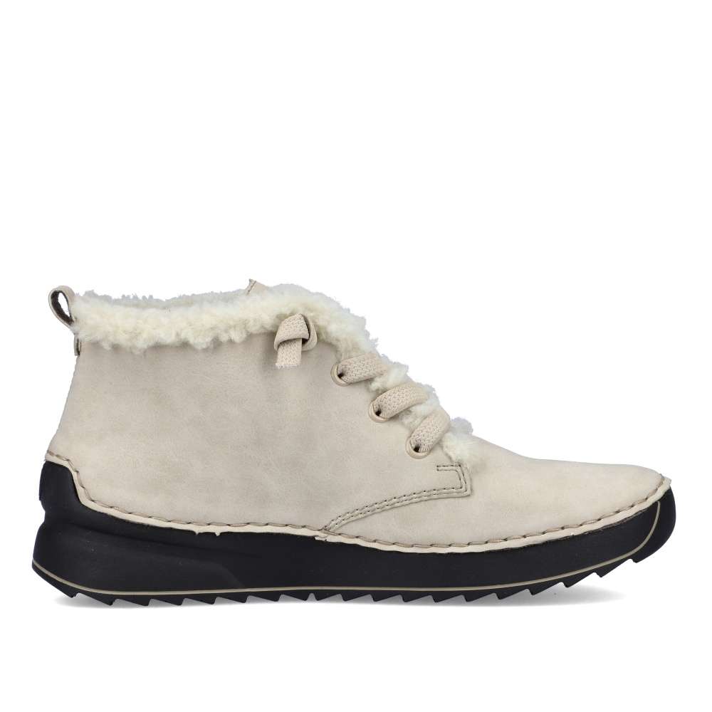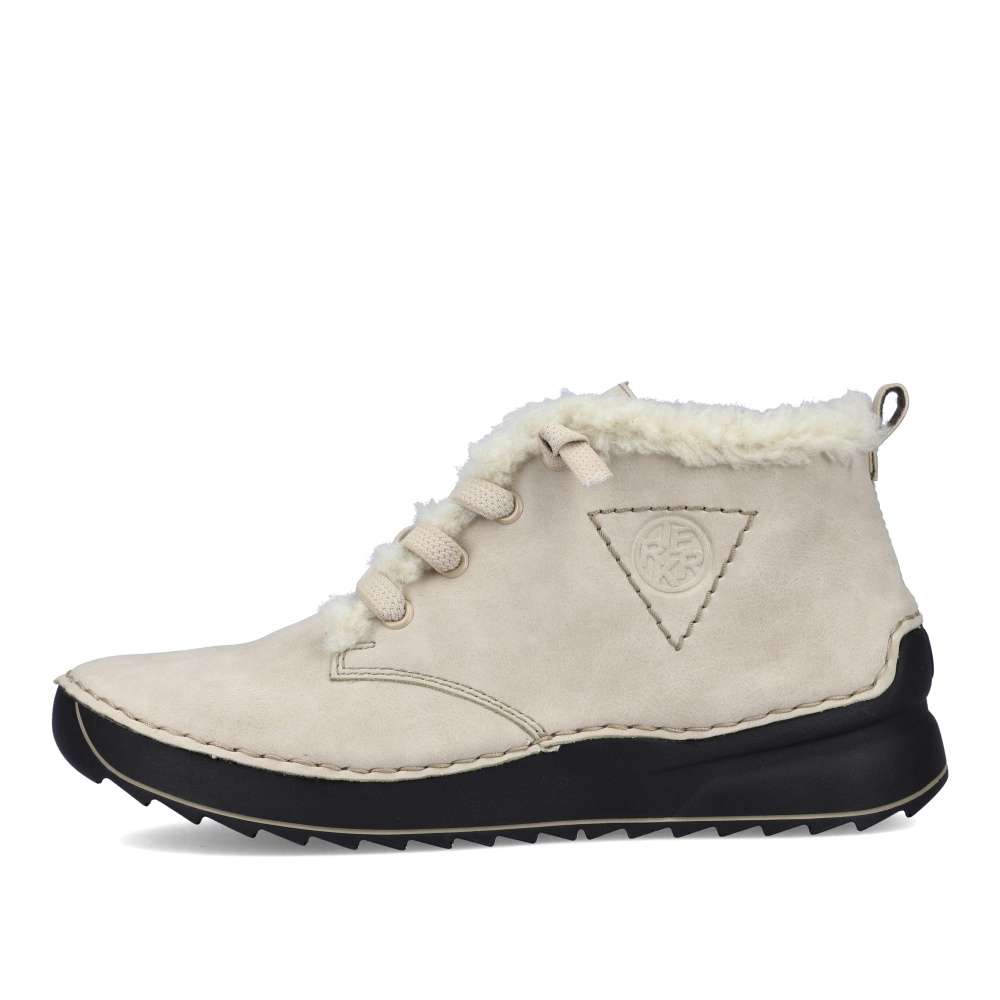 Tato moderní kotníková obuv od značky Rieker je unikátním kouskem, který musíte mít ve svém botníku. Svršek z kombinovaných materiálů je zdoben lehkým šitím a logem značky na vnější straně. Šněrování zajistí, že Vám bota skvěle sedne. Kožíšek lemující kotník a tkaničky dodává obuvi na originalitě. S měkkou stélkou se budete cítit pohodlně na každém kroku i po celý den.