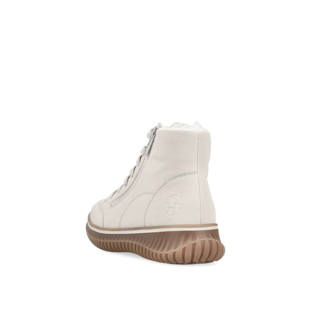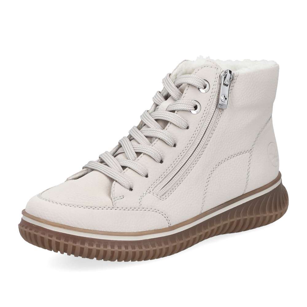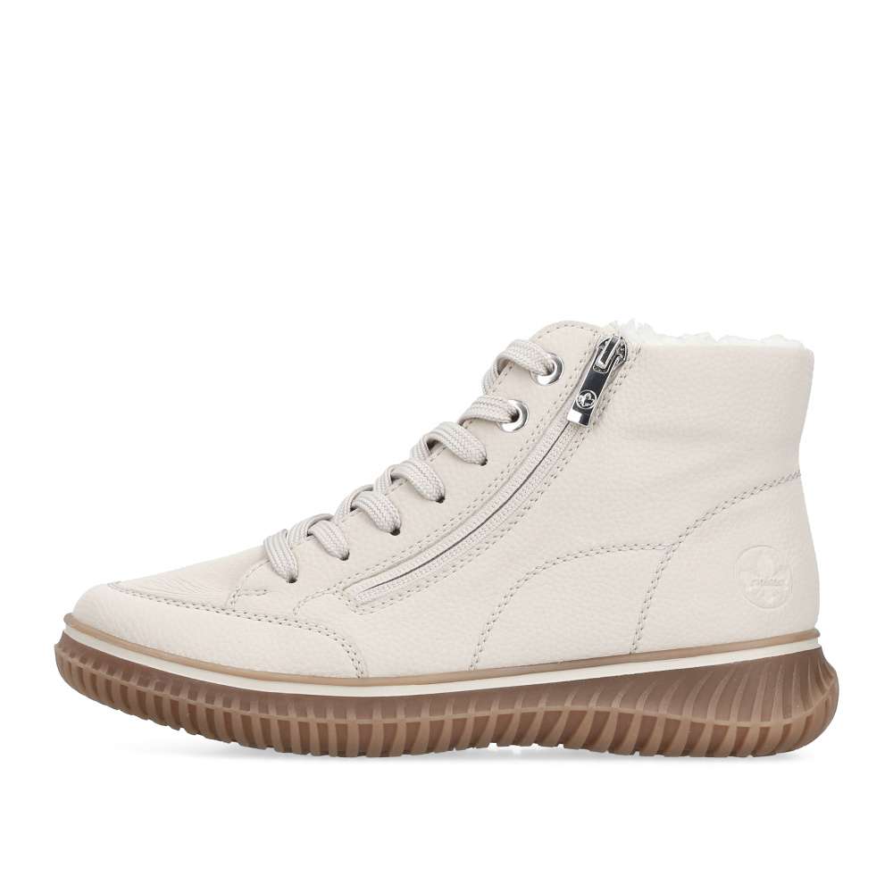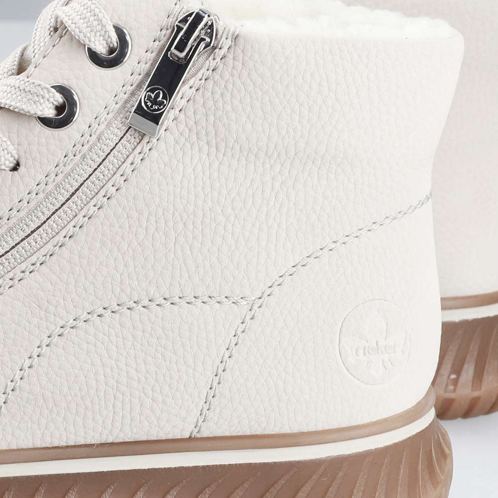 Kotníkové boty RIEKER v béžovém provedení spojují styl a funkčnost do každodenního nošení. Světlý svršek s jemným prošíváním a kovovými detaily doplňuje praktický zip lemující nárt, který zjednodušuje obouvání a sněrování zajistí ideální přizpůsobení chodidlu. Hřejivá podšívka a měkká, vyjímatelná stélka zaručí komfort po celý den. Podešev s technologií Antistress tlumí nárazy a dodává potřebnou flexibilitu při chůzi. Ideální model pro ženy, které očekávají spolehlivost, pohodlí a nadčasový vzhled v jednom.