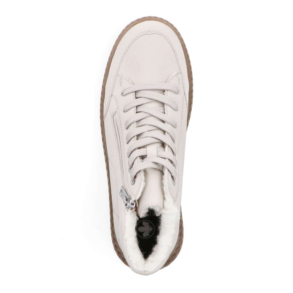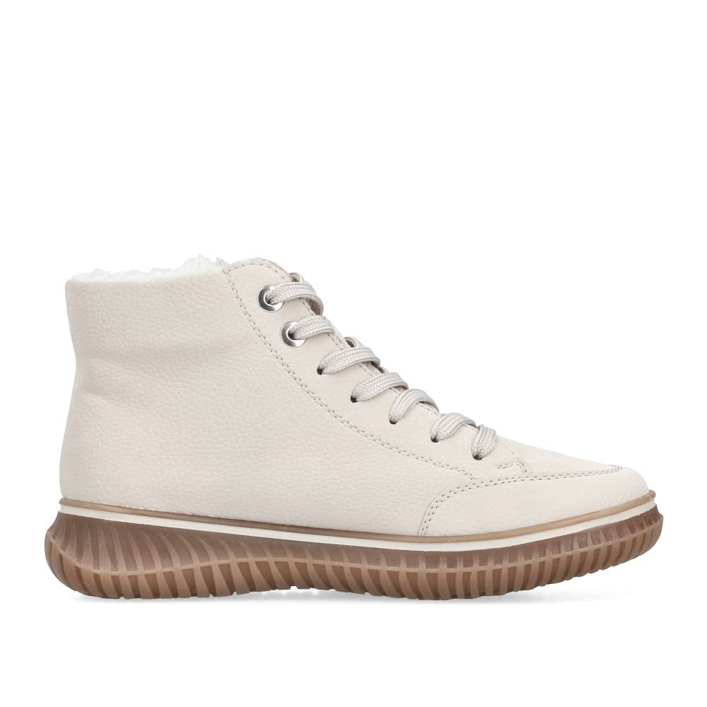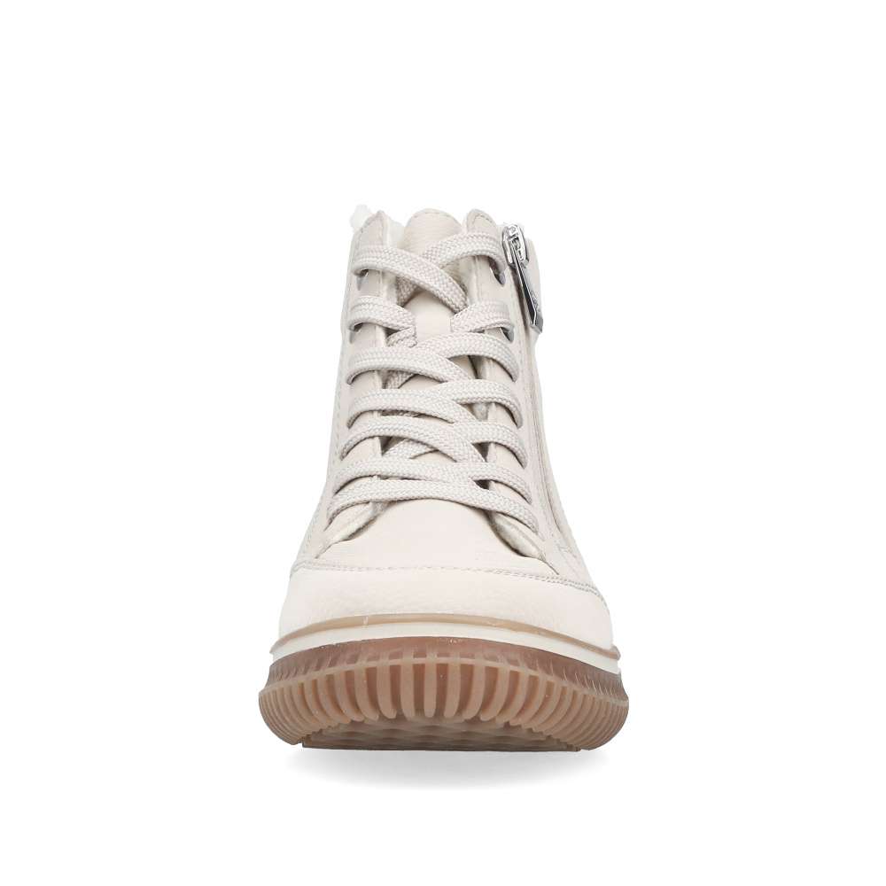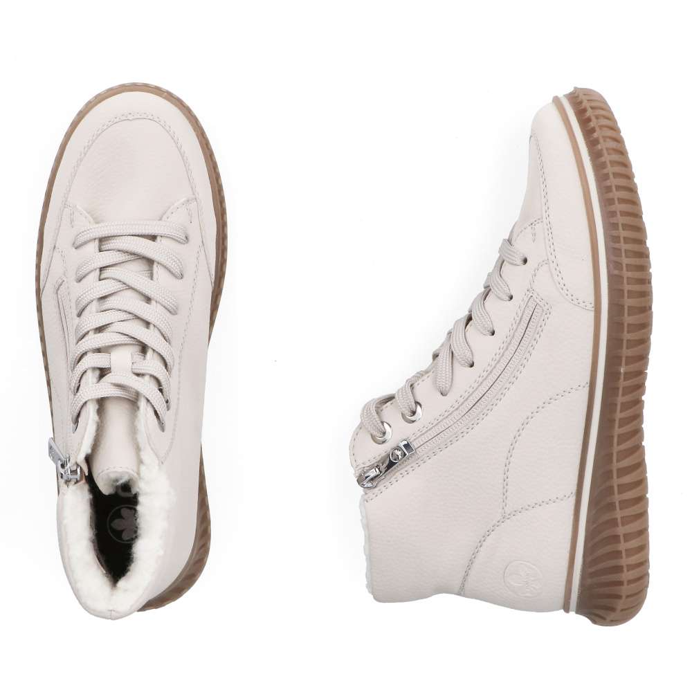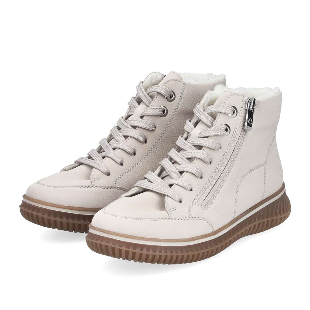 Kotníkové boty RIEKER v béžovém provedení spojují styl a funkčnost do každodenního nošení. Světlý svršek s jemným prošíváním a kovovými detaily doplňuje praktický zip lemující nárt, který zjednodušuje obouvání a sněrování zajistí ideální přizpůsobení chodidlu. Hřejivá podšívka a měkká, vyjímatelná stélka zaručí komfort po celý den. Podešev s technologií Antistress tlumí nárazy a dodává potřebnou flexibilitu při chůzi. Ideální model pro ženy, které očekávají spolehlivost, pohodlí a nadčasový vzhled v jednom.