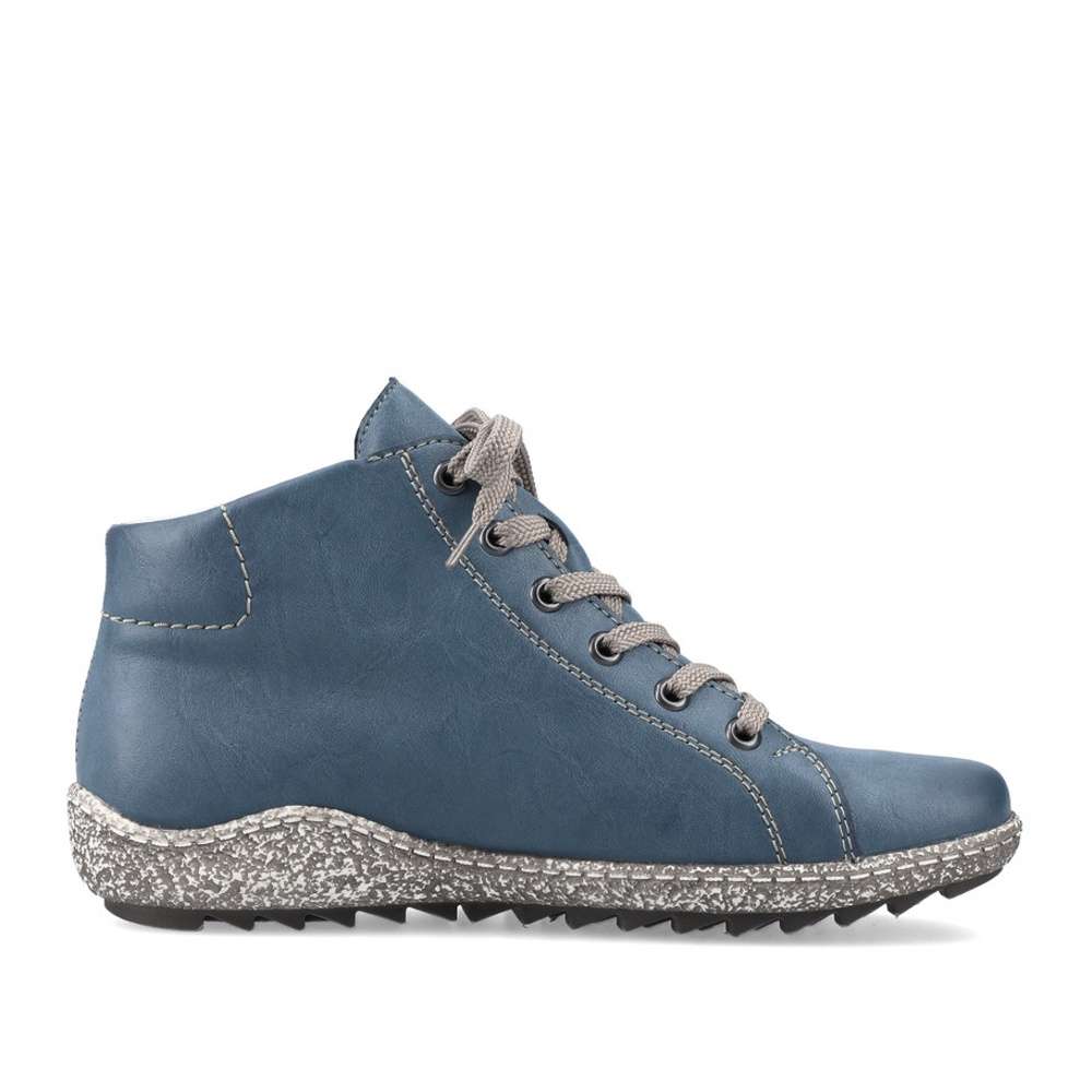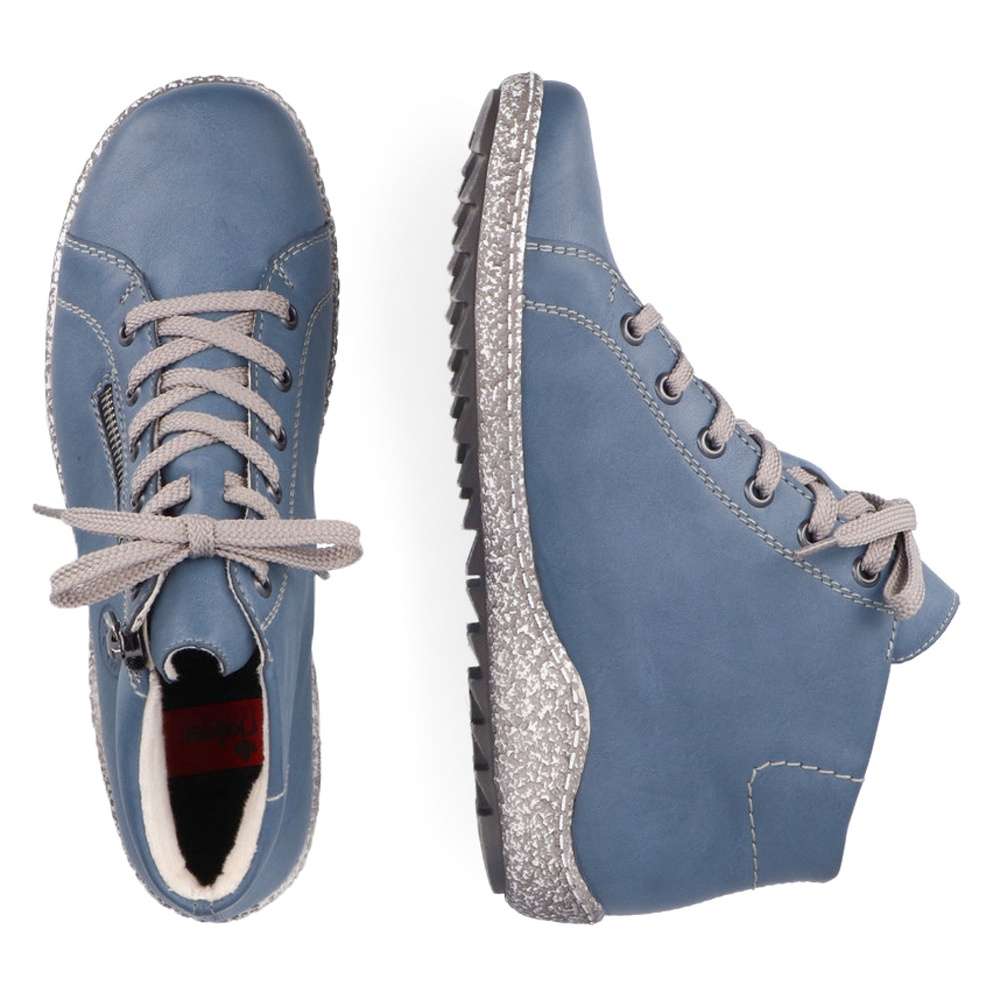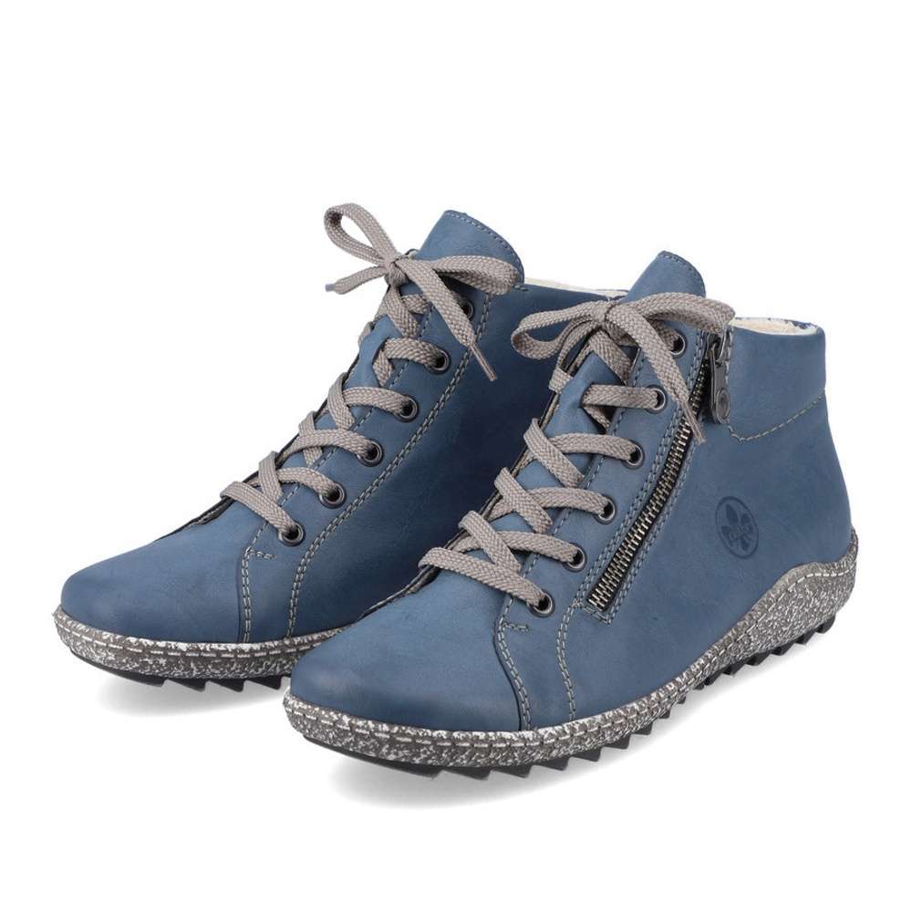 Úžasný dámský kotník značky RIEKER vyniká nad ostatní svou barvou. Krásný modrý svršek je zdobný vytlačeným logem značky a kontrastním prošíváním. Šněrováním šedými tkaničkami a funkčním zipem si pak upravíte obuv přímo k Vaší noze. Vyjímatelnou stélku můžete kdykoliv vyvětrat či vyměnit. Ať už je obujete na procházku nebo do města, nebudete litovat, nikdy Vás nezklamou. Technologie: Antistress – podešev je díky této technologii lehká, flexibilní, absorbuje nárazy při došlapu a snadno se přizpůsobí každé noze.