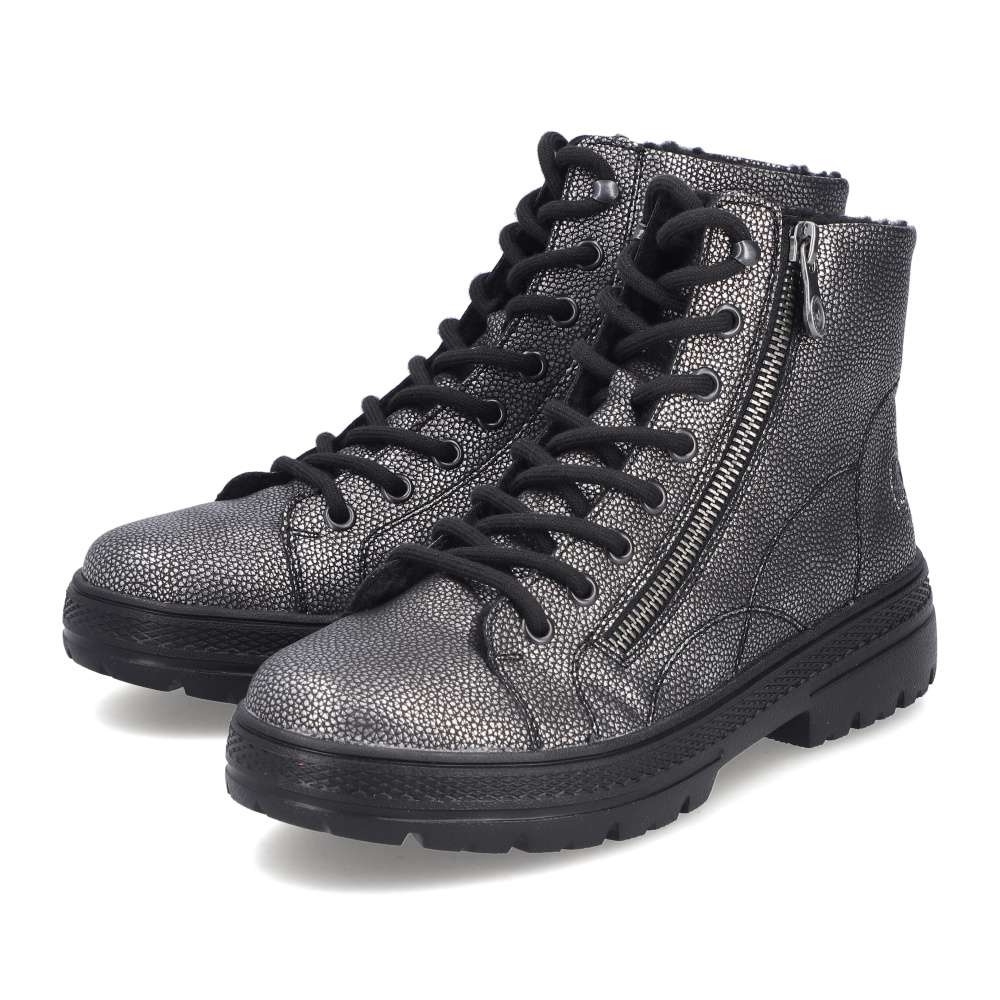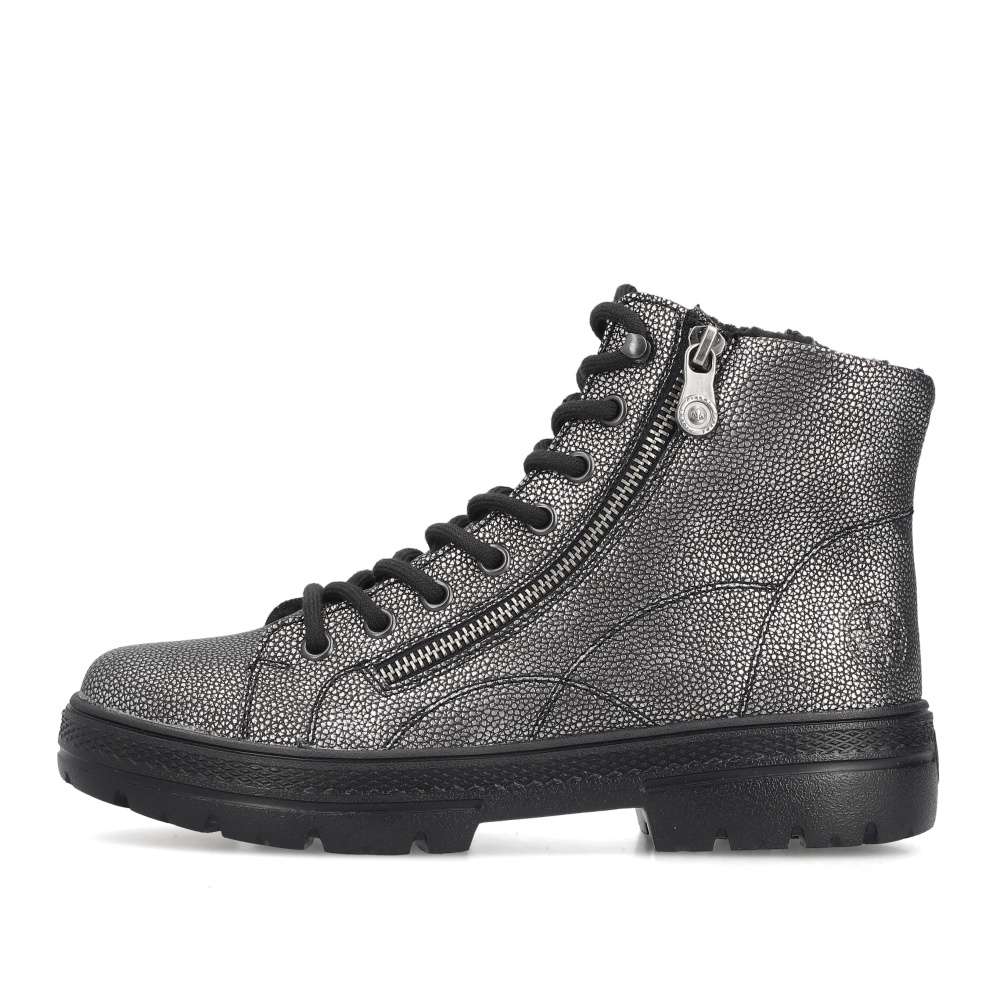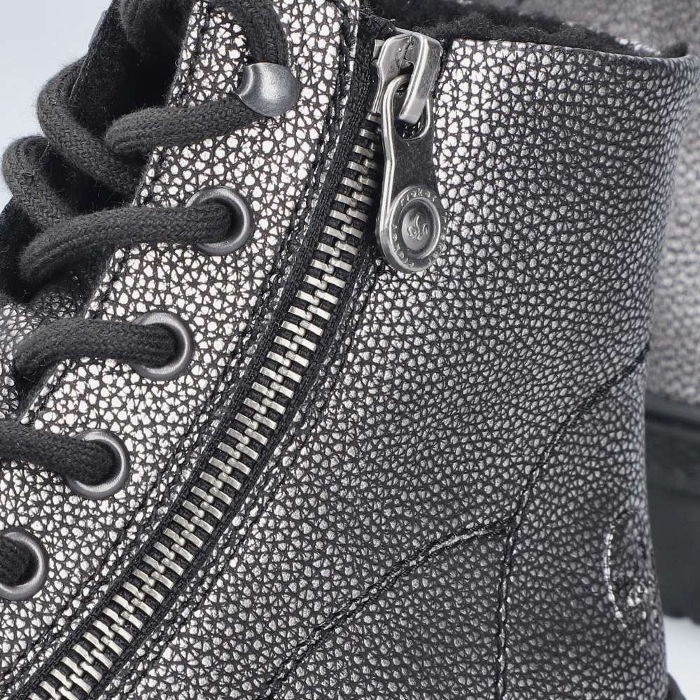 Tyto kotníkové boty RIEKER zaujmou na první pohled svým originálním designem – strukturovaný materiál s metalickými odlesky dodává modelu moderní a výrazný vzhled. Praktický zip umístěný na nártu umožňuje rychlé a pohodlné obutí, zatímco šněrování zajistí ideální přizpůsobení podle tvaru vaší nohy. Podešev s technologií tlumení nárazů poskytuje maximální komfort při chůzi, což oceníte zejména během dlouhých dní na nohou. O teplotní komfort se postará hřejivé vnitřní zateplení, díky kterému budou vaše nohy v teple i během zimního počasí. Stylové, pohodlné a funkční - tyto boty jsou perfektní volbou pro ženy, které chtějí i v zimě vypadat skvěle a cítit se komfortně.