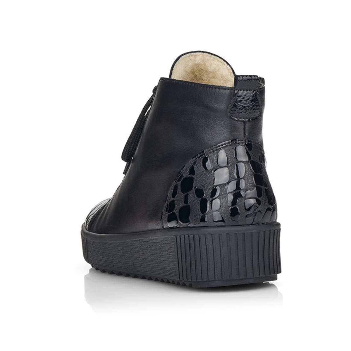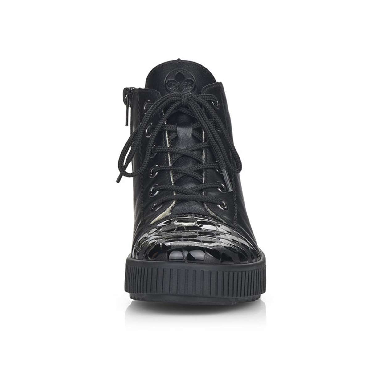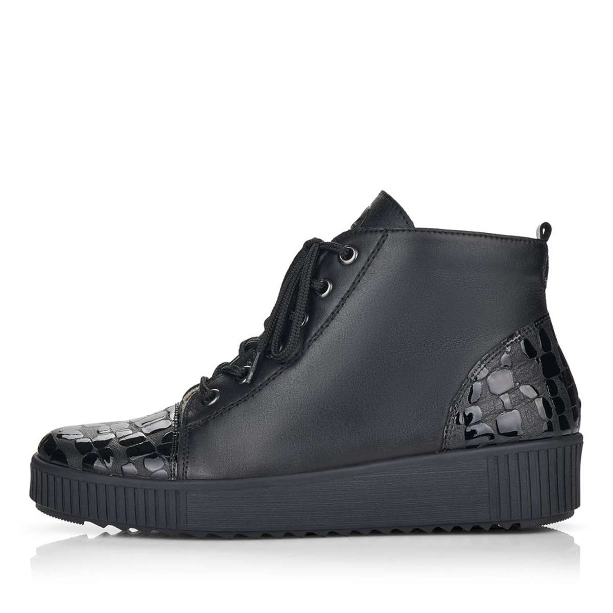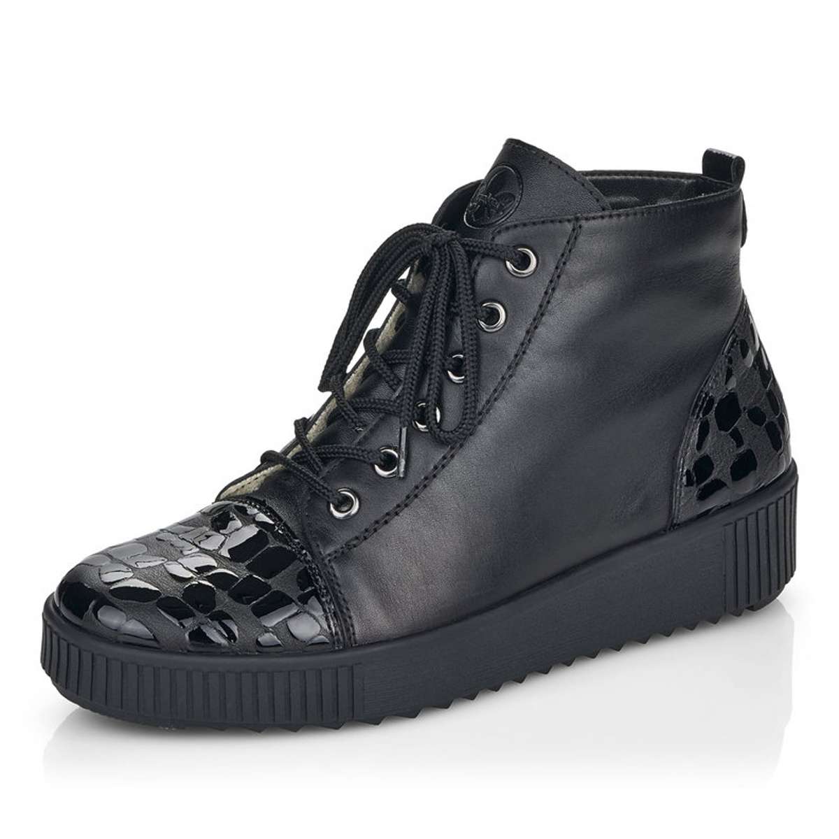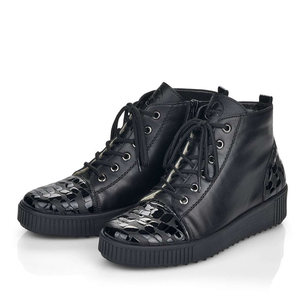 Exkluzivní dámský model s lesklými detaily v přední a zadní části od značky Rieker. Kvalitní svršek je vyrobený z pravé přírodní usně v černé barvě. Boty jsou šněrovací a na vnitřní straně mají funkční zip, který Vám skvěle usnadní nazutí. Podšívka z pravé ovčí vlny krásně zahřeje a podešev s hrubším vzorkem zajistí bezpečnou chůzi. Tyto kotníkové boty udělají radost nejen Vám ale i Vašim blízkým.