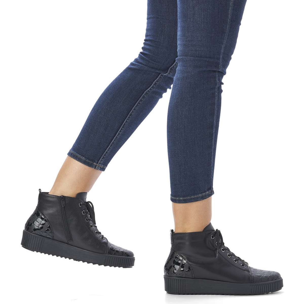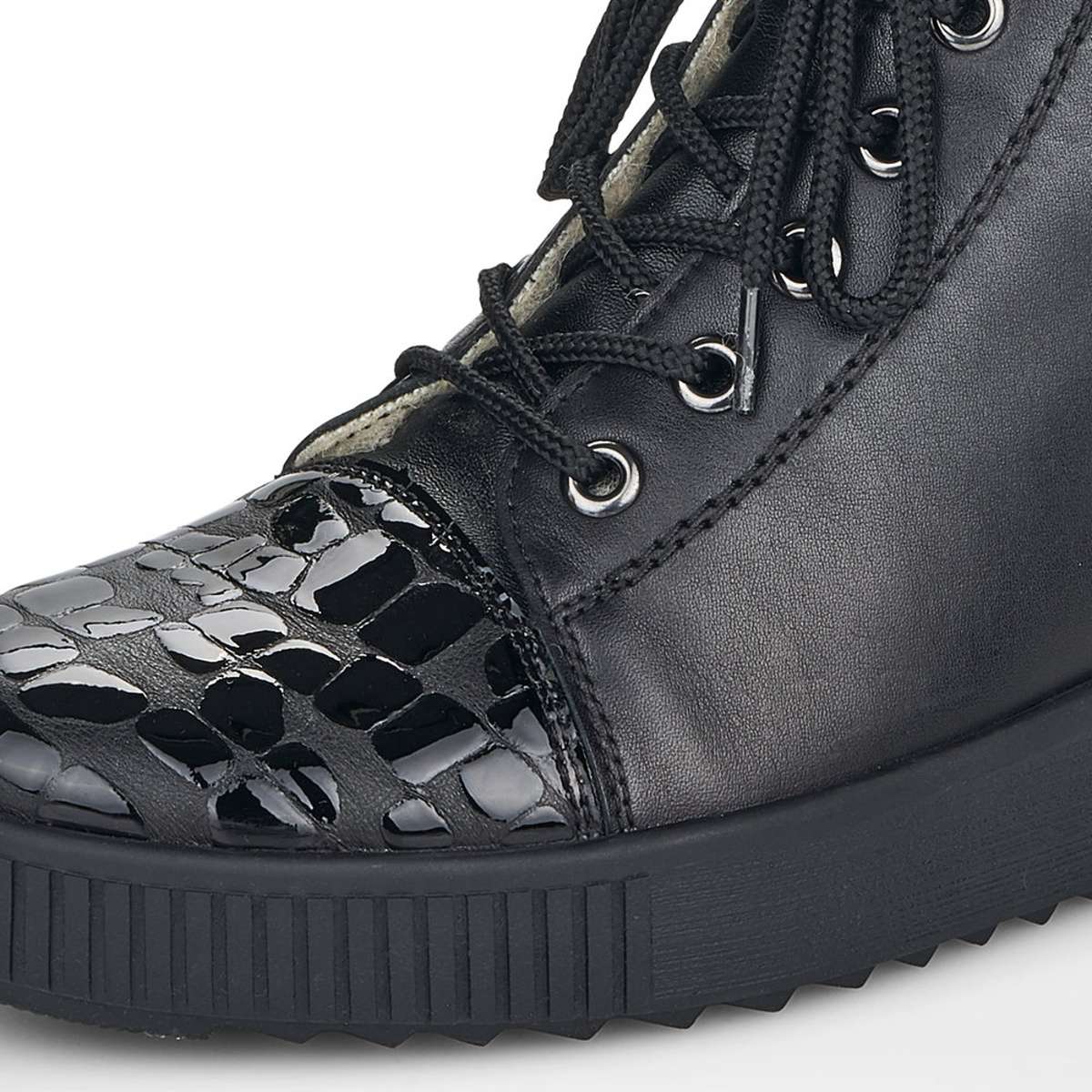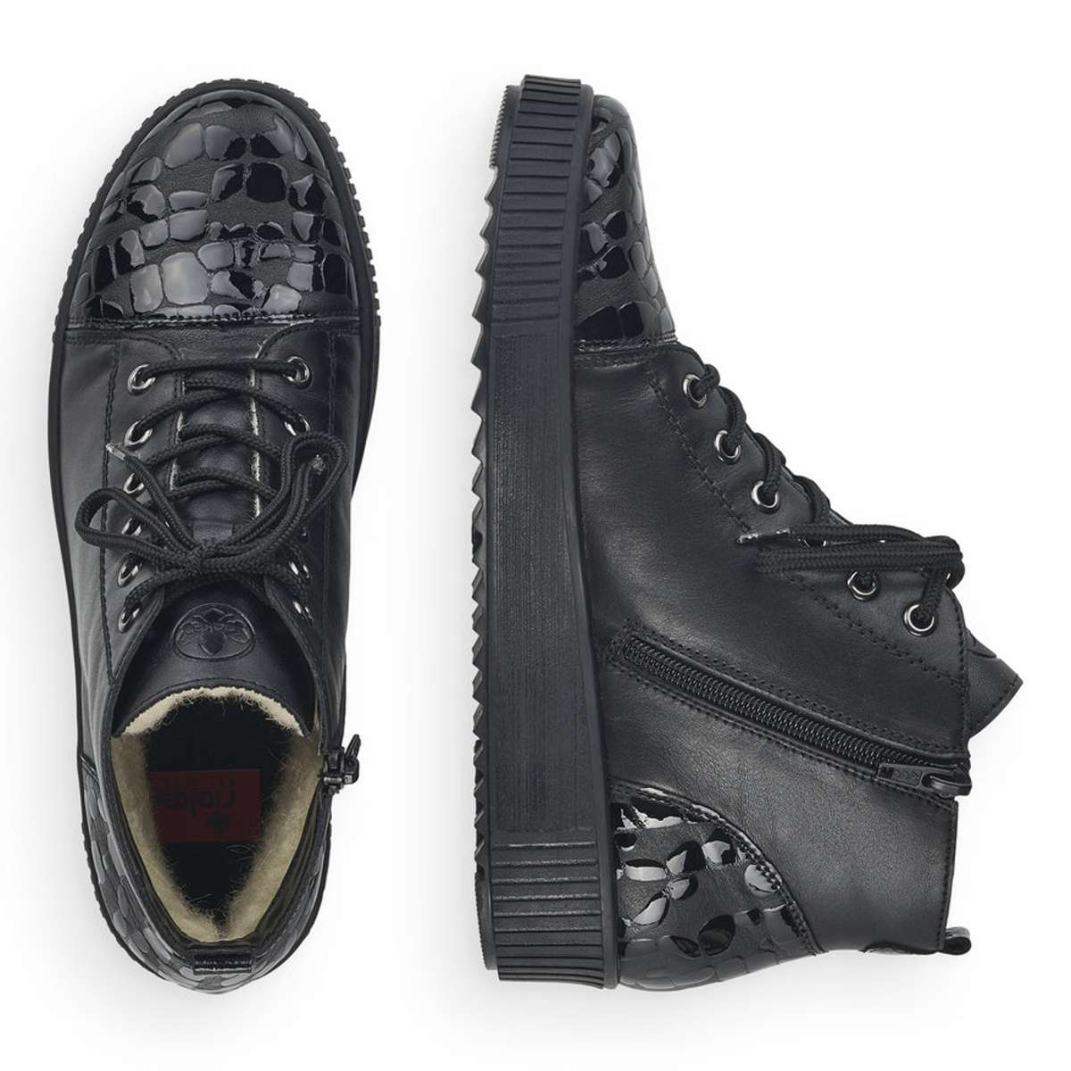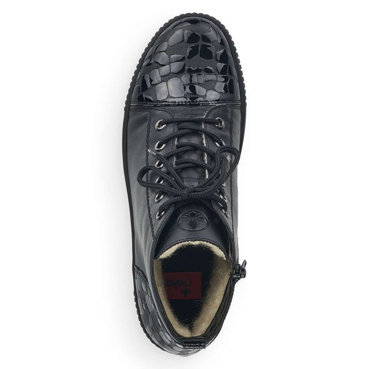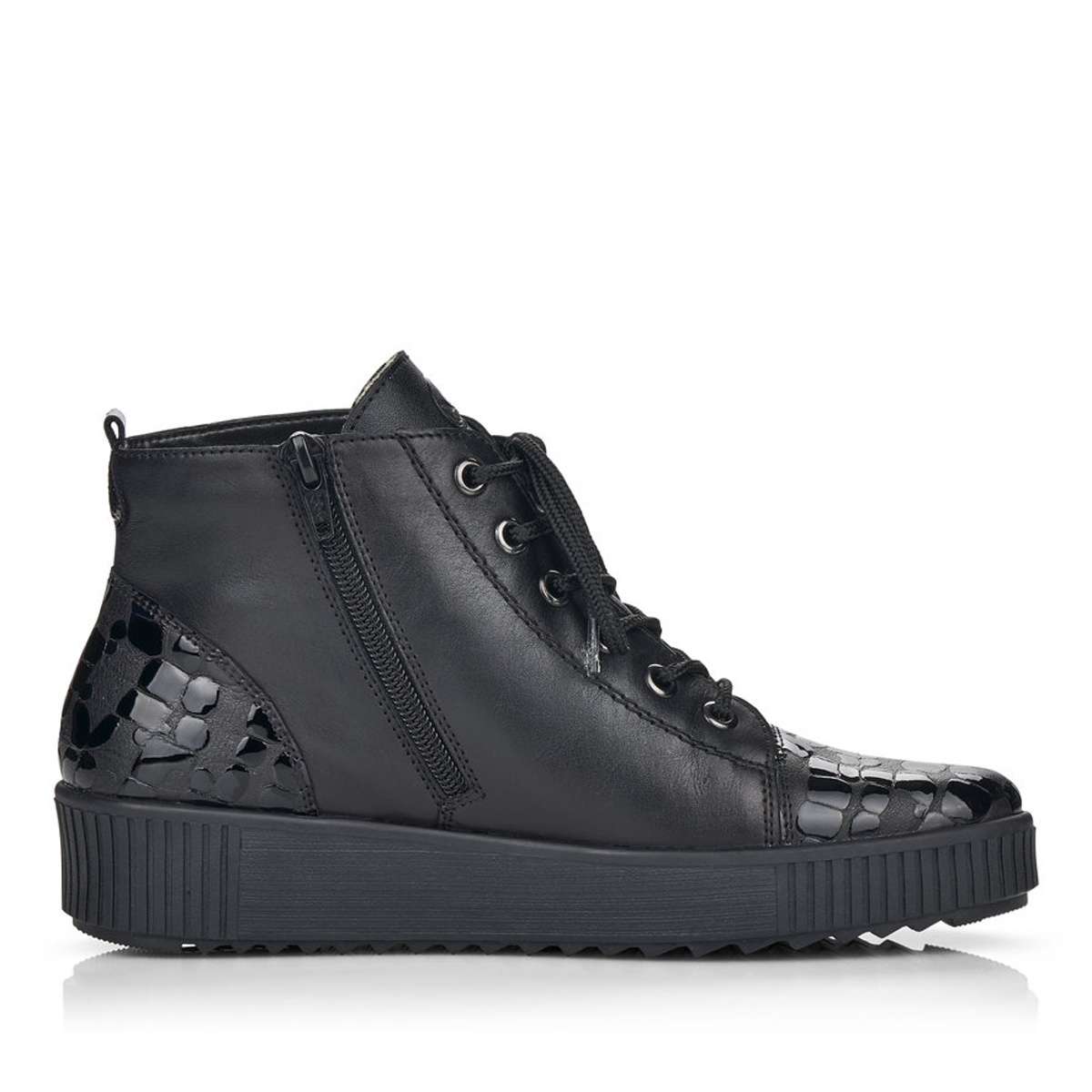 Exkluzivní dámský model s lesklými detaily v přední a zadní části od značky Rieker. Kvalitní svršek je vyrobený z pravé přírodní usně v černé barvě. Boty jsou šněrovací a na vnitřní straně mají funkční zip, který Vám skvěle usnadní nazutí. Podšívka z pravé ovčí vlny krásně zahřeje a podešev s hrubším vzorkem zajistí bezpečnou chůzi. Tyto kotníkové boty udělají radost nejen Vám ale i Vašim blízkým.