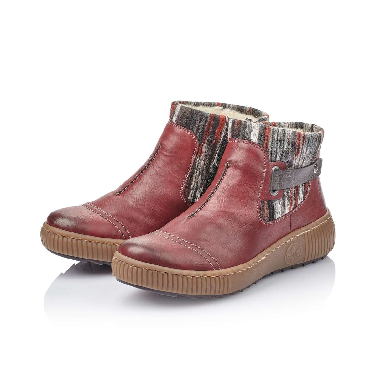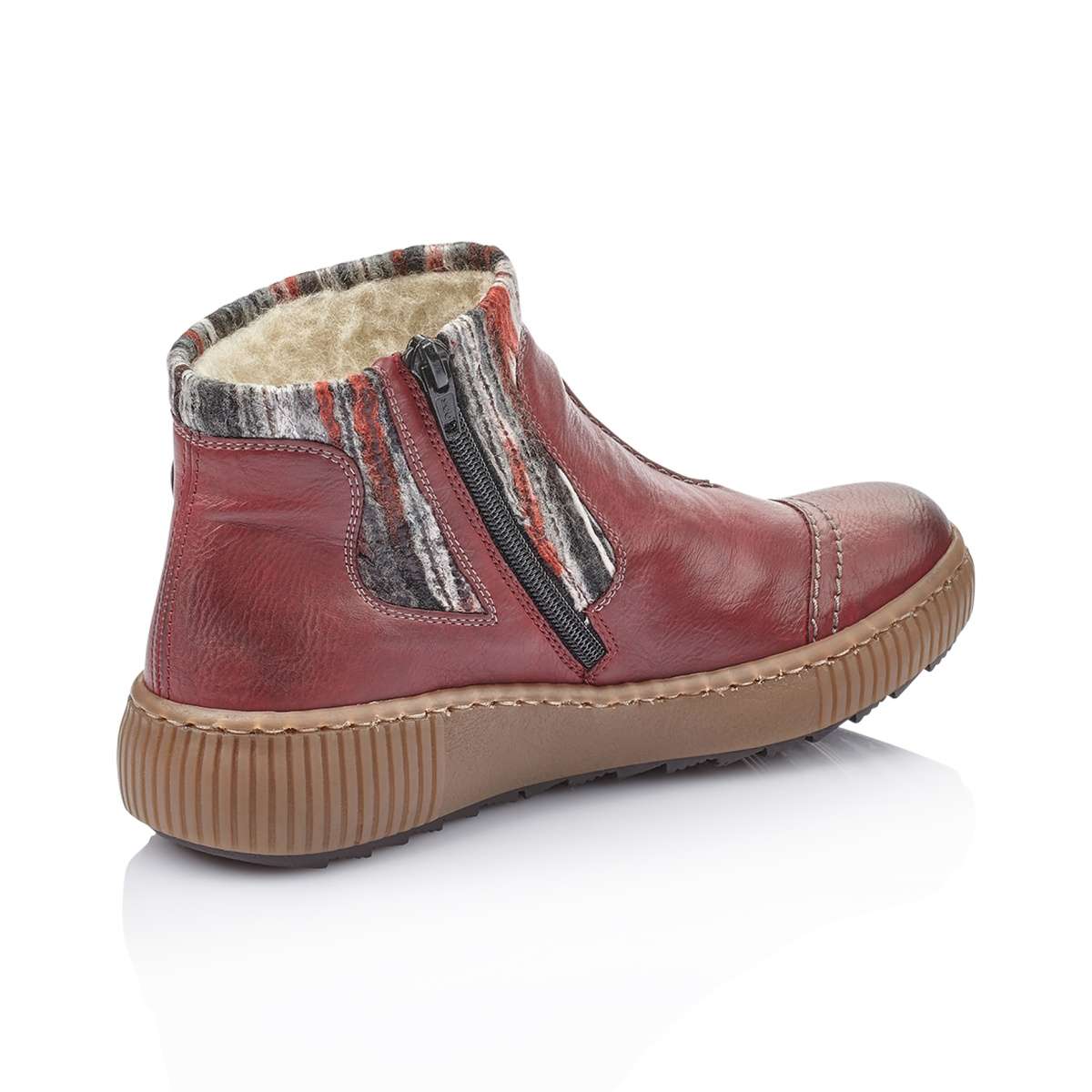 Dámské kotníky červené barvy jsou zdobené barevným úpletem s nádechem extravagance, elegantním šitím a hnědým páskem s kovovou aplikací na vnější straně. Na vnitřní straně je funkční zip pro snadné prozutí. Vyjímatelnou stélku můžete kdykoliv vyměnit či vyvětrat. Teplou podšívku z pravé ovčí vlny oceníte při celodenních procházkách nebo během cesty do práce.