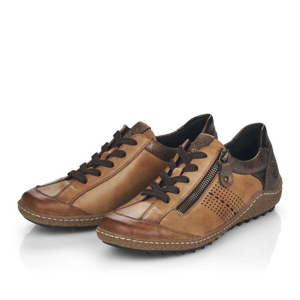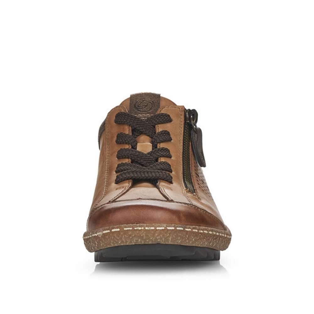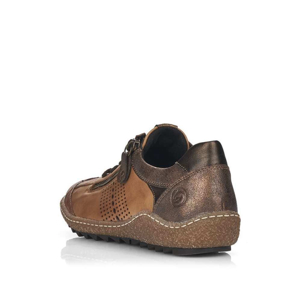 Obuv REMONTE – jedná se o vyšší řadu značky RIEKER, tato obuv se vyznačuje vynikající kombinací svrchních materiálů. Ležérní, volnočasové tenisky jsou vhodné ke každodennímu užívání. Svršek vyrobený z pravé hladké kůže je zdobný jemným prošíváním, povrchovou perforací a bronzovou patní částí. Snadné nazouvání zajistí funkční zip umístěný na vnější straně nártu a dokonalé přizpůsobení obuvi dosáhnete, díky šněrování kontrastními tkaničkami. Unikátní stélka z paměťové pěny změkčí každý Váš došlap a kontrastní podešev zdobná imitací šití je v nejvyšším místě pod patou vysoká cca 1,7 cm. Tento model snadno sladíte s Vaším outfitem ať už se v nich vydáte na procházku či posezení s přáteli.