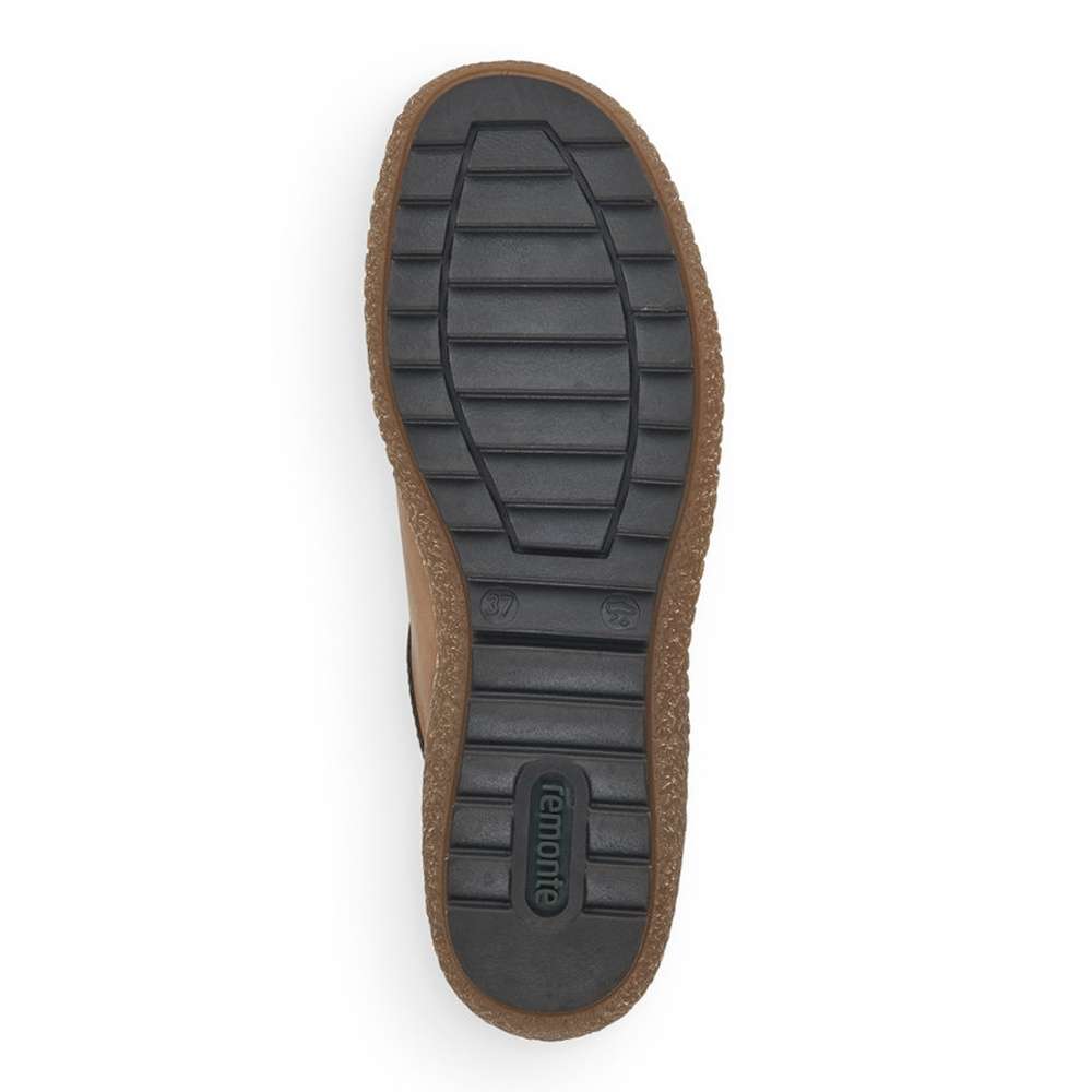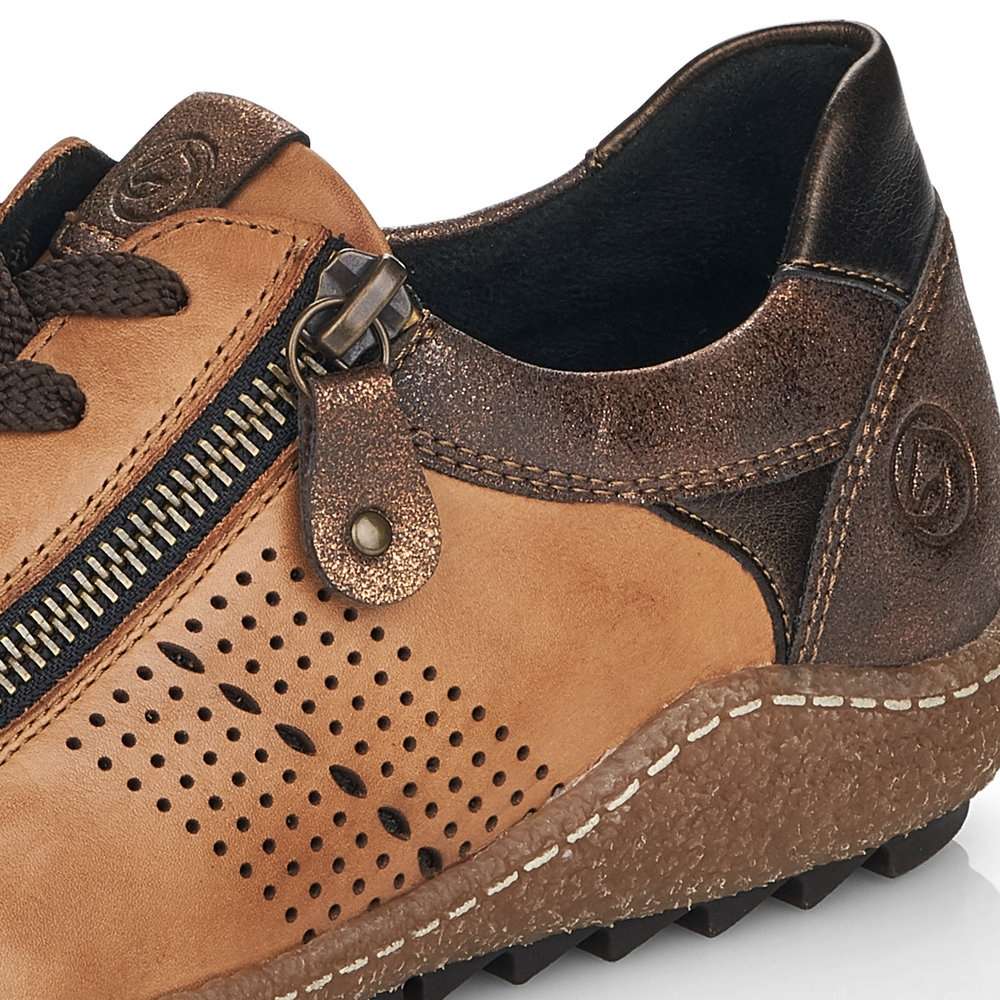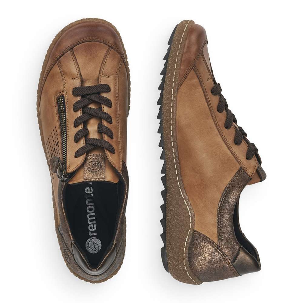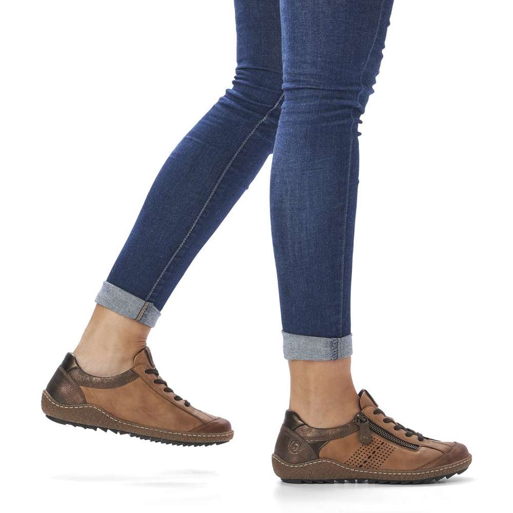 Obuv REMONTE – jedná se o vyšší řadu značky RIEKER, tato obuv se vyznačuje vynikající kombinací svrchních materiálů. Ležérní, volnočasové tenisky jsou vhodné ke každodennímu užívání. Svršek vyrobený z pravé hladké kůže je zdobný jemným prošíváním, povrchovou perforací a bronzovou patní částí. Snadné nazouvání zajistí funkční zip umístěný na vnější straně nártu a dokonalé přizpůsobení obuvi dosáhnete, díky šněrování kontrastními tkaničkami. Unikátní stélka z paměťové pěny změkčí každý Váš došlap a kontrastní podešev zdobná imitací šití je v nejvyšším místě pod patou vysoká cca 1,7 cm. Tento model snadno sladíte s Vaším outfitem ať už se v nich vydáte na procházku či posezení s přáteli.
