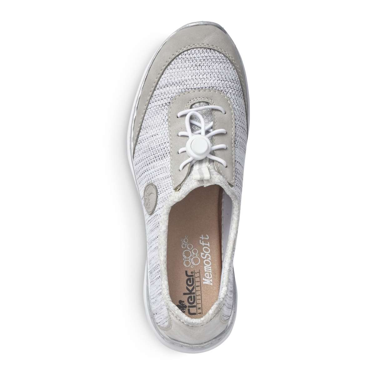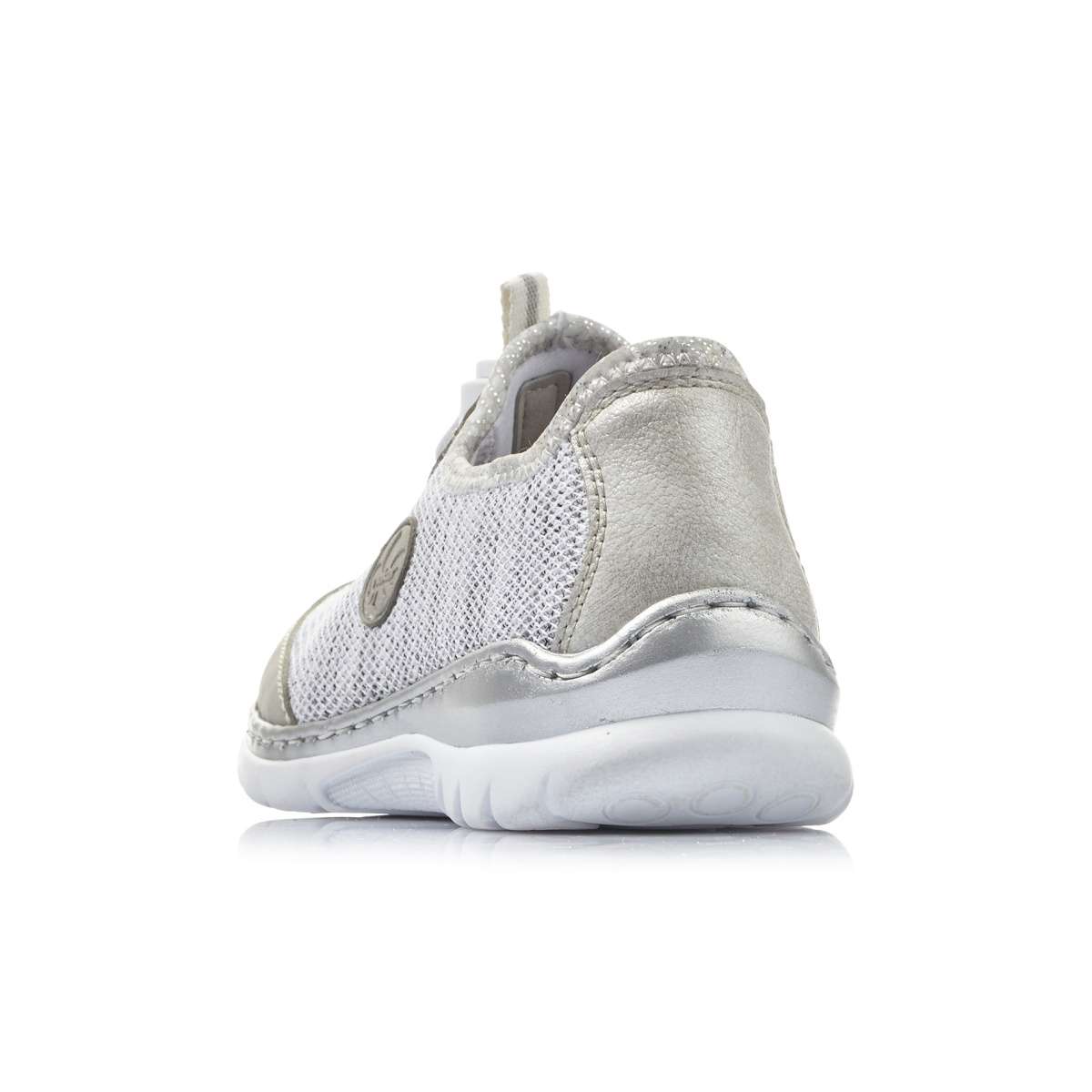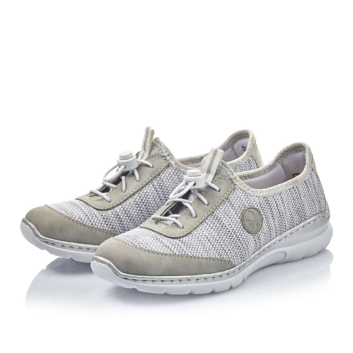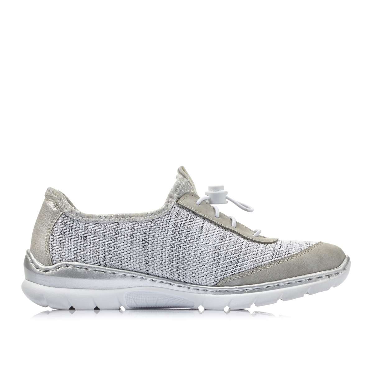 Tato dámská teniska značky Rieker Vás nadchne na první pohled. Kvalitní svršek je vyroben v kombinaci hladkého materiálu a vzdušného žíhaného pleteninového materiálu. Celkový vzhled doplní prošívání, logo značky na vnější straně a šedé lemování podešve. Šněrování na pružné gumičky Vám pomůže s přizpůsobením obuvi dle svých potřeb a můžete si je obout snad ke každému outfitu.