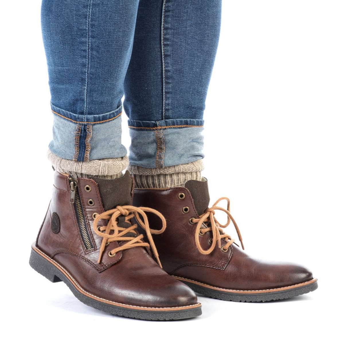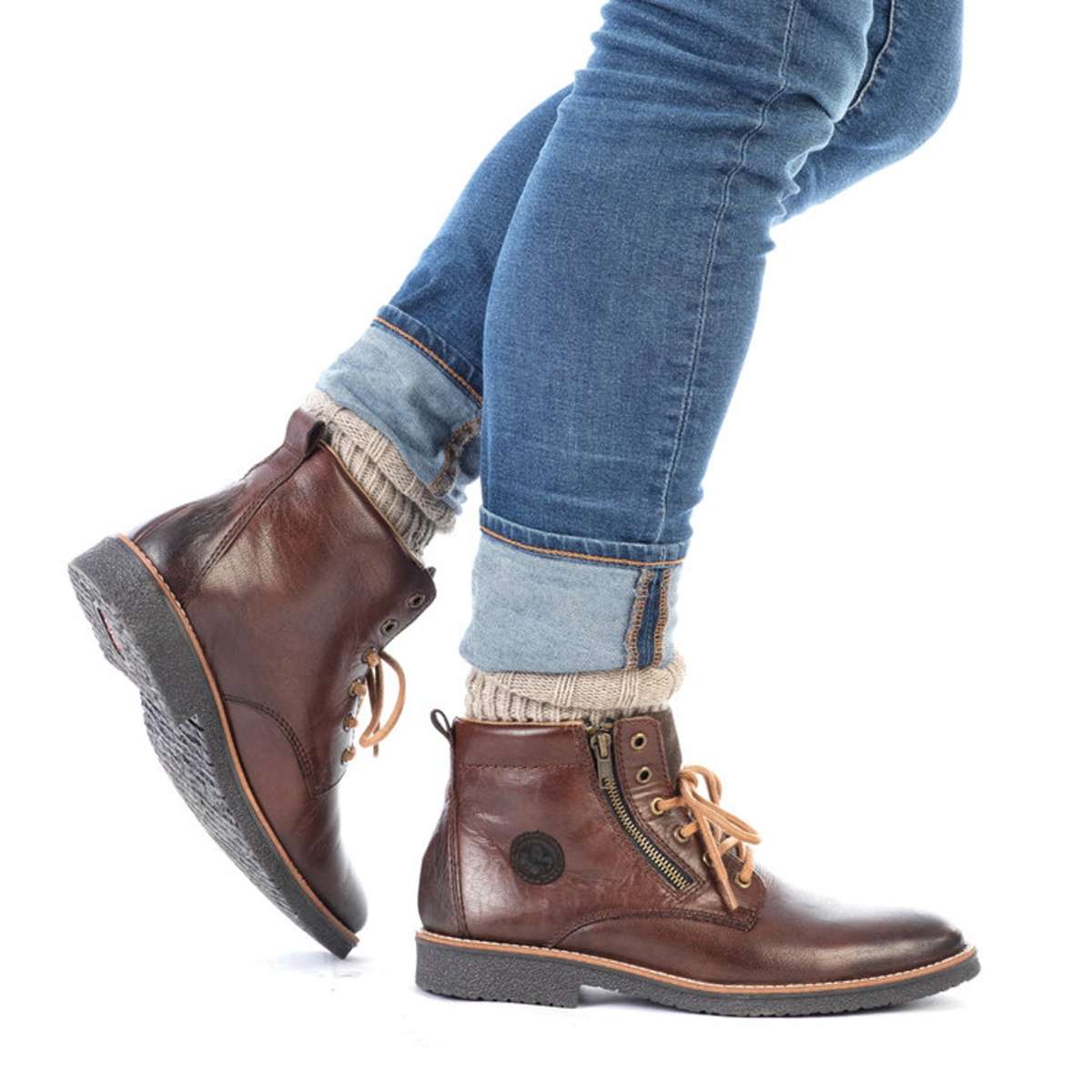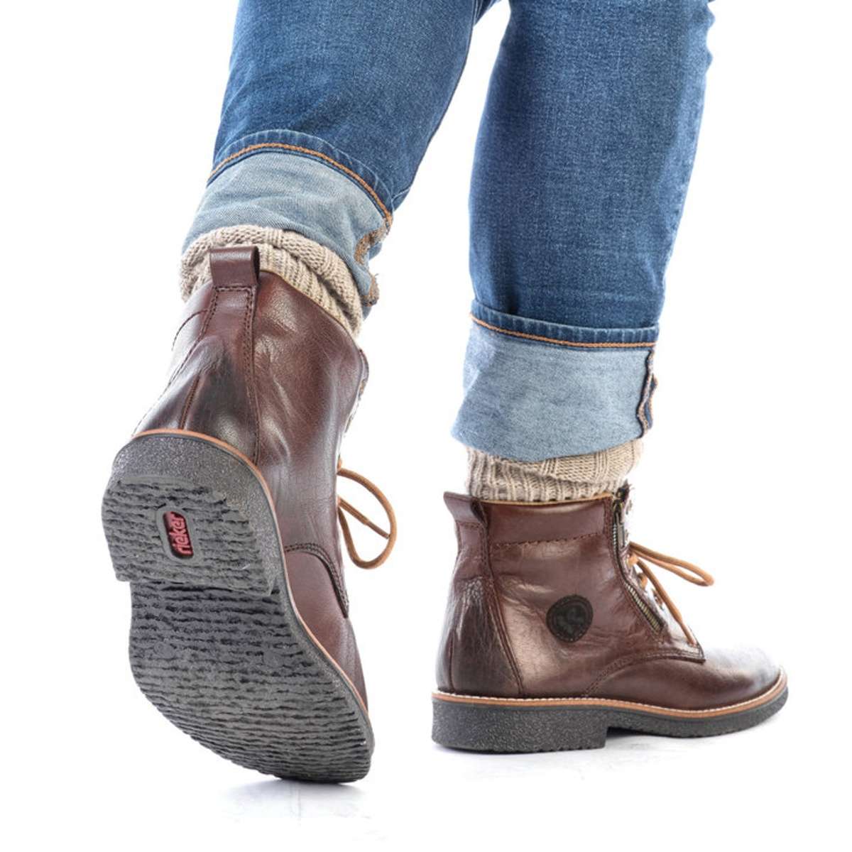 Tyto hnědé kožené kotníky značky RIEKER zaručeně oživí Vaše zimní outfity a budou Vás bavit. Zdobnými prvky jsou prošívání a logo značky na vnější straně. Pro snadné nazouvání slouží nejen šněrování, ale také funkční zip. Decentní podešev je vyrobena z kvalitního materiálu, který je doplněn o technologii Antistress. Pohodlí na každém kroku Vám zaručí měkká stélka a vy je nebudete chtít zout. Skvělý společník a zároveň pohodlná botička, to tady máme právě pro Vás. Technologie: Antistress – podešev je díky této technologii lehká, flexibilní, absorbuje nárazy při došlapu a snadno se přizpůsobí každé noze Podšívka je vyrobena z pravé ovčí vlny.